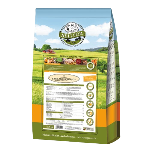 Bellfor Freiland-Schmaus wurde entwickelt, um die Ernährungsbedürfnisse von mittelgrossen Hunden zu erfüllen. Das Futter enthält kein Getreide und keine künstlichen Aromen oder Konservierungsstoffe.