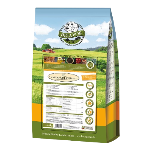 Bei Bellfor wissen wir sehr genau, wie wichtig eine ausgewogene Ernährung für ein langes und vitales Hundeleben ist. Um Ihnen eine artgerechte Fütterung zu ermöglichen, nutzen wir für unseren Naturfarm-Schmaus ausschliesslich hochwertige Rohstoffe in Lebensmittelqualität, die wir schonend und sorgfältig verarbeiten.