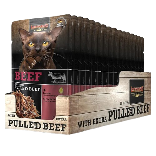 Ob bei einem Barbecue mit Pulled Meat oder einem Pulled Beef Burger im Restaurant – in Erinnerung bleiben immer das einzigartige „Kauerlebnis“ und der besondere Geschmack des gezupften Fleisches. Mit „LEONARDO Pulled Beef“ kommen jetzt auch Katzen in genau diesen Genuss! Jede Portion wird schonend gegart und mit Lachsöl verfeinert. Lachsöl liefert zudem mehrfach ungesättigte Fettsäuren für ein besonders seidiges Fell.