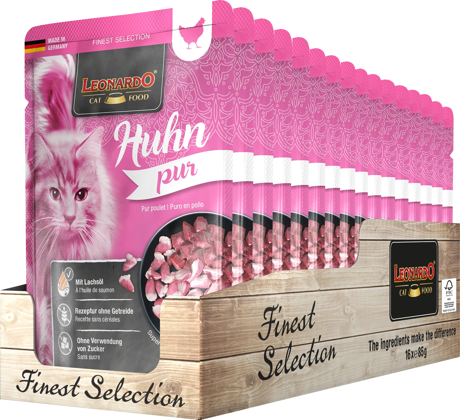 Für Purrristen: Die unwiderstehliche Mischung aus hochwertigem, magerem Hühnerfleisch, schmackhaften Innereien und Lachsöl mit mehrfach ungesättigten Fettsäuren macht LEONARDO Huhn pur zu einem klaren Favoriten im Napf. Steigert den Schnurrfaktor und verleiht dem Fell einen schönen Glanz!