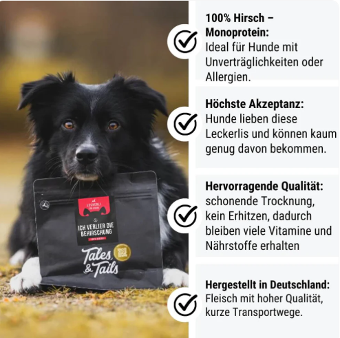 Leckerli aus 100 % reinem Hirsch sorgen dafür, dass selbst der ruhigste Hund vor Begeisterung die BeHIRSCHung verliert. 🦌
