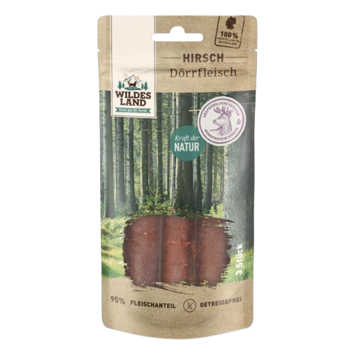 Das Dörrfleisch Hirsch basiert auf der Ursprünglichkeit und Kraft der Natur. Die getreidefreie Rezeptur enthält als Fleischquelle ausschliesslich Hirsch für eine artgerechte Belohnung und besticht durch eine hohe Akzeptanz und gute Verträglichkeit. Die schmackhafte Rolle wird durch natürliches Kollagen stabilisiert und ist aufgrund ihrer Form besonders gut zu kauen. Auch beim Snack zwischendurch ist es wichtig, auf Qualität und Inhaltsstoffe zu achten. Alle unserer Produkte von Wildes Land sind frei von Farb-, Aroma- und Konservierungsstoffen. Zudem werden die Snacks ausnahmslos ohne Tierversuche entwickelt und produziert.