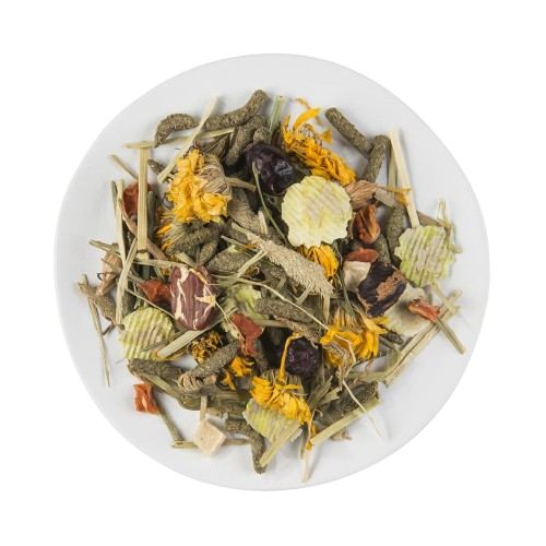 Pflanzliche Nebenerzeugnisse (4 % Wiesenlieschgrasheu, 3 % Ringelblume, 0,2 % Nessel), Gemüse (1 % Paprika), Getreide, Früchte (4 % Hagebutten), Öle und Fette, Mineralien