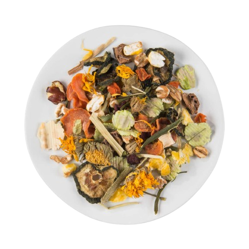 Körner (3% Popcornmais), Gemüse (2% Gurkenscheiben, 0,5% Pfeffer), Pflanzliche Nebenerzeugnisse (3% Ringelblume, 2% Dill)
